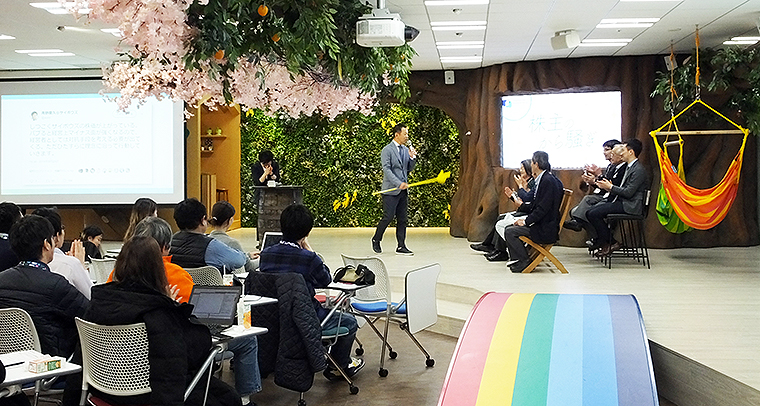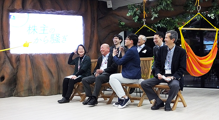 「株主総会って、これまではひな壇に経営陣が立って、株主と対峙するかたちだったんですよね。そこで今回は、株主の方もひな壇に上がってもらって、経営陣も株主もみなさんで、サイボウズの課題について語ってもらおうというわけです」(山田副社長)