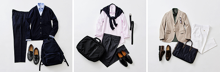 左下は「カジュアルなアイテムでもビジネスウェアとして活用できる、清潔感のあるブルーワントーンコーデ」。