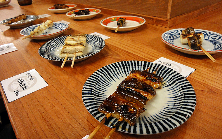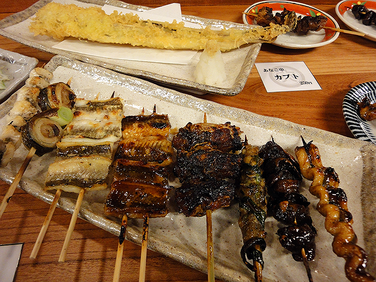 穴子は高タンパク、低カロリーなのに、活力源になる食材。酒場 大穴(ダイアナ)では、部位ごとにさばき、腹肉、背肉、尾、ヒレ、肝、頭まで、串打ちして焼き上げ、ここにしかない「あなご串」が思いっきり体感できる。