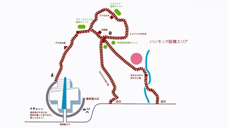 森の遊歩道では、ハンモックにゆられながらくつろいだり、新緑を眺めたりと、美術鑑賞をするだけでなく、自然に溶け込み感性を解放させるようなひと時が過ごせます。