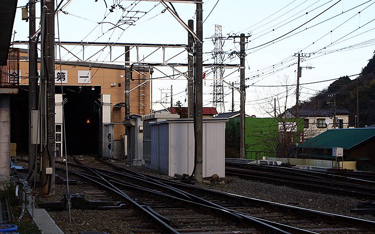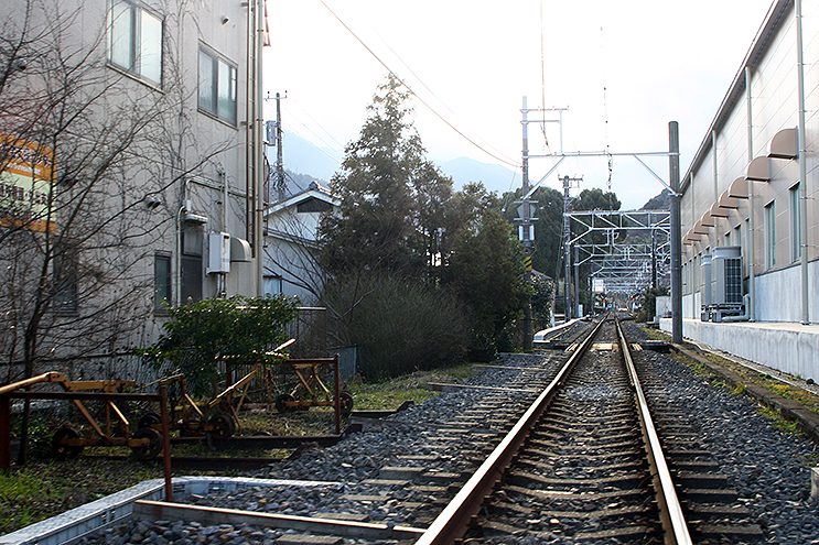 ここはロマンスカーなども走る、狭軌1067mmの線路。右が入生田車庫。この車庫は箱根登山鉄道の車両が入る1435mmの標準軌。