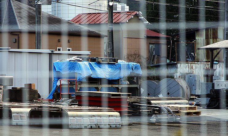 フェンス越しに、入生田車庫のなかに整然と置いてあるクーラーや車輪、パンタグラフがみえたり……。