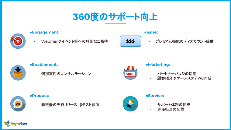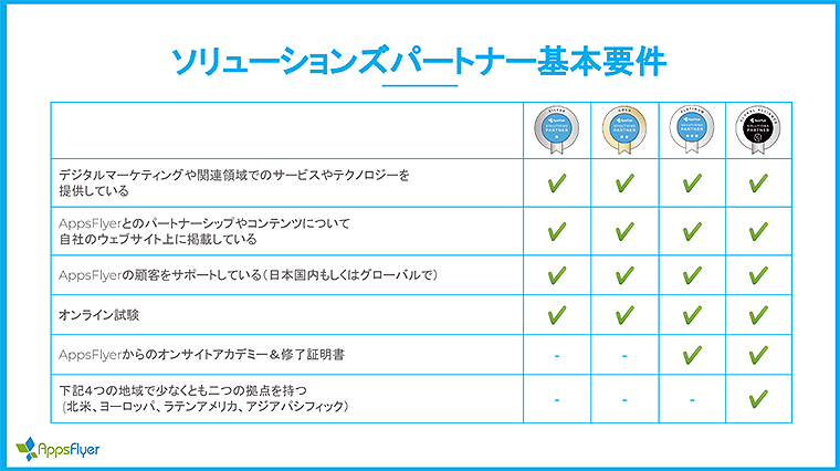 AppsFlyerソリューションズパートナーシッププログラム(ASPP)を採り入れた広告代理店には、AppsFlyer のエコシステムへの貢献レベル、広告主への貢献レベル、AppsFlyerのソリューションに関する専門知識レベルにもとづき、4つのレベル(シルバー、ゴールド、プラチナ、グローバルアライアンス)の認定バッヂを付与。