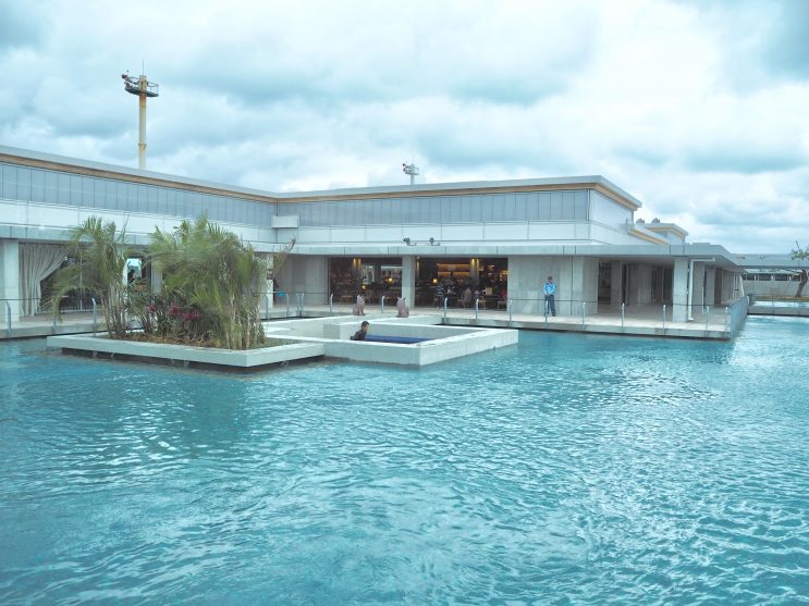 みやこ下地島空港ターミナルに到着しました!大きな水上ラウンジがあったりコテージ風の建物だったりと、まるでリゾートホテルのような佇まい。南国ならではのゆったりとした時間が流れています。