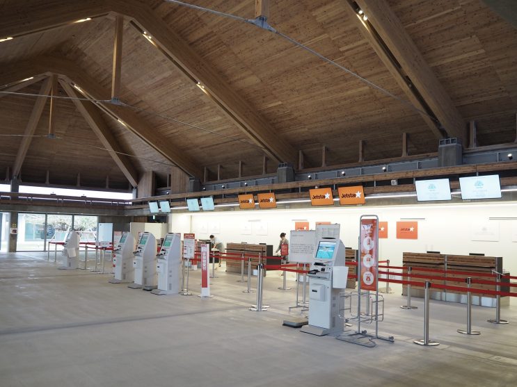 お次はチェックインエリア。広々としたチェックインカウンターがあります。成田行きの飛行機が飛び立った後ですので今は誰もいません。天井が高くて開放感があり、高級リゾートホテルのロビーでチェックインしているような気分になります。