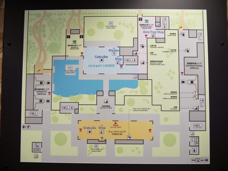 こちらがみやこ下地島空港ターミナル内のマップ。緑が多く、自然と共存した造りになっているのが分かりますね。エリアごとにじっくり見ていきましょう!