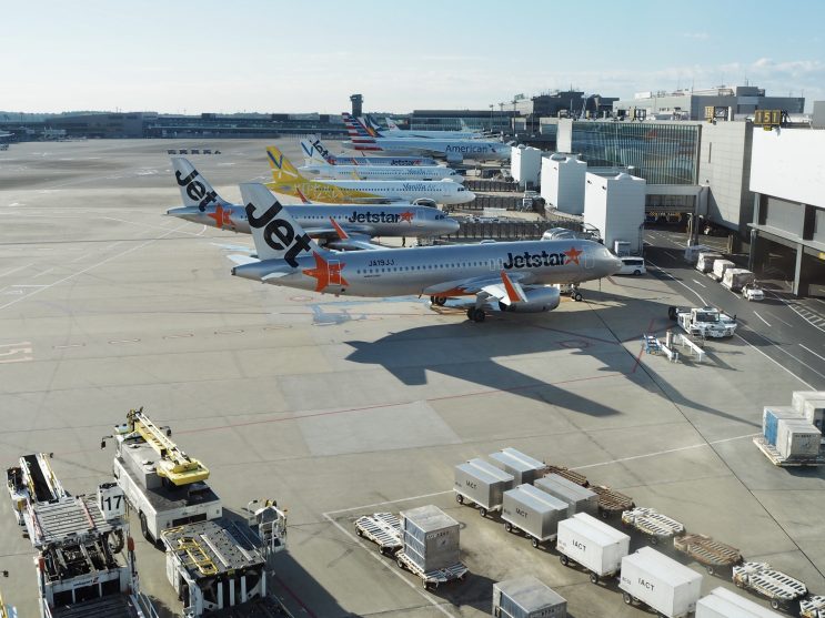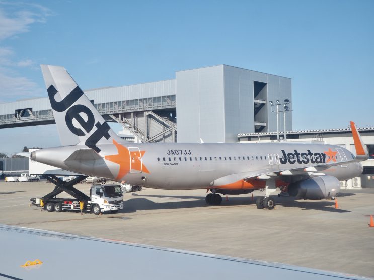 成田空港の第3ターミナルでチェックインを済ませ、搭乗口へ向かいます。ちなみにジェットスターのチェックインはネット上でも可能。カウンターでの手間が省けてありがたいですね。スタンバイしている飛行機が目の前に見えてきました。