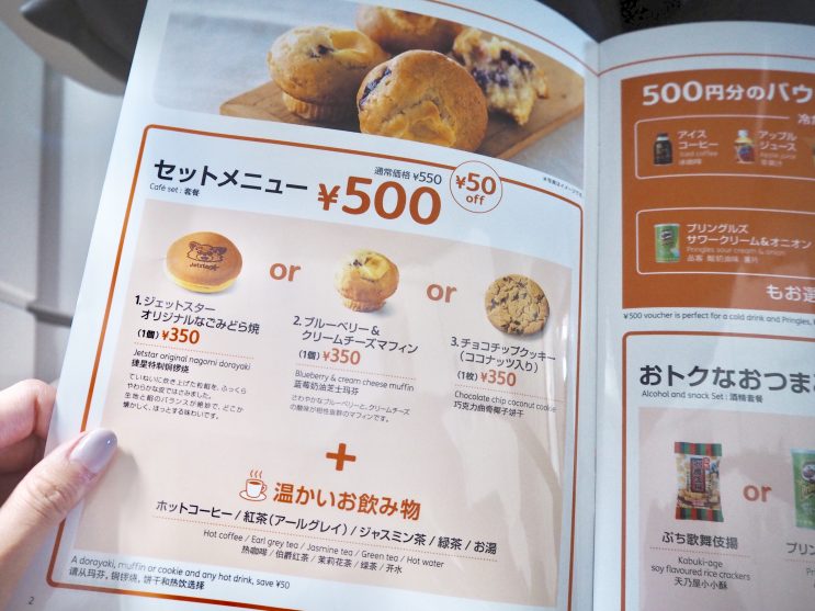 ジェットスターは機内食やグッズも充実しています。Jetstar Caféの機内限定メニューからは公式キャラクター「ジェッ太」の焼印が入ったオリジナルなごみどら焼が購入できます。成田山表参道にある老舗和菓子店「なごみの米屋」で作られているという本格派。空の上でもカフェを楽しめるよう素材にもこだわっているようですね。