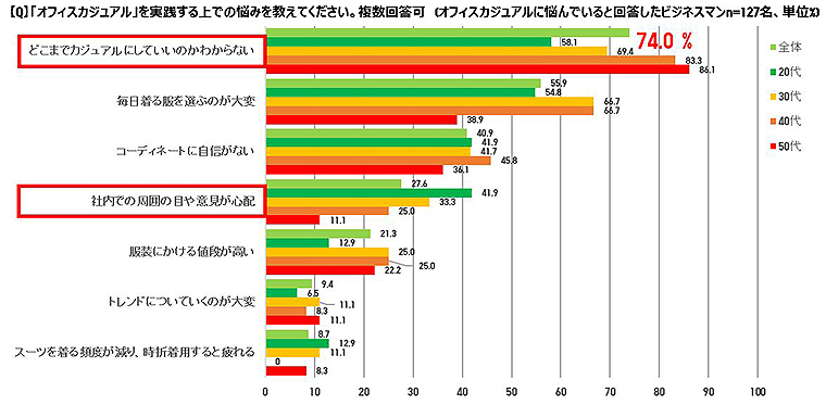 ―――ユニクロが20~50代のビジネス系男性412人に調査したところ、全世代で「どこまでカジュアルにしたらいいのかわからない」という回答が7割を超え、40~50代男性は8割以上がそう回答したという。