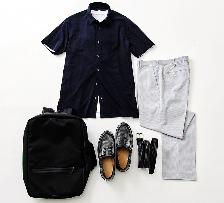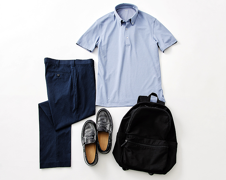 ネイビーのシアサッカー素材の感動パンツに同じブルートーンのエアリズムポロシャツで、清涼感抜群のクールビズスタイルに。
