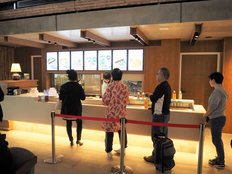 通過後に入るのが「coral port LOUNGE」。ラウンジ内にはおしゃれな「Cafe & Bar」や「the Kitchen」「coral port the Shop」があります。「Cafe & Bar」ではリゾート感溢れる色鮮やかなカクテルや、地元でも人気のアルコール・おつまみ類が販売されています。内装には沖縄の高級木材であるテリハボクが使用されているようですよ。