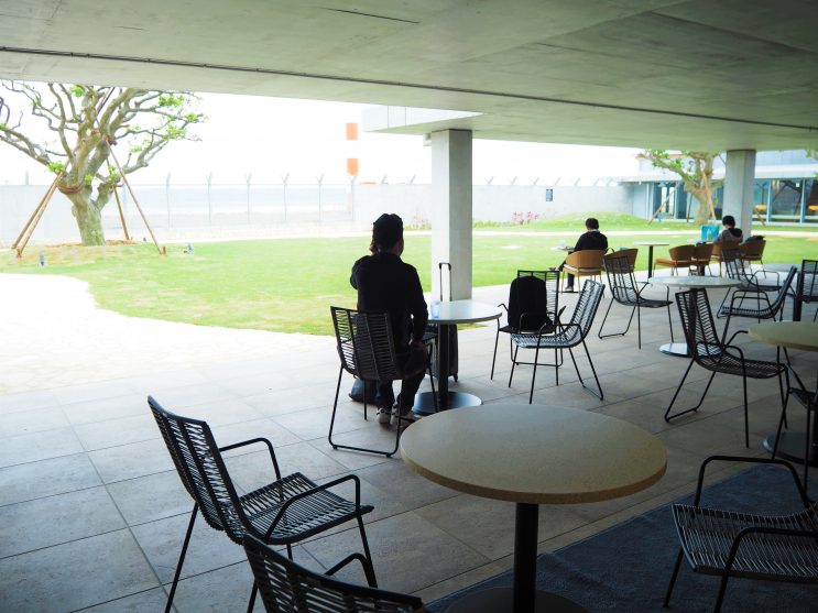 ラウンジの先には飛行機の発着の様子が見られる中庭も。搭乗前に外でのんびりできる空港って珍しいですよね。