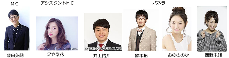 柴田英嗣(アンタッチャブル)、足立梨花、井上裕介(NONSTYLE)、鈴木拓(ドランクドラゴン)、おのののか、西野未姫