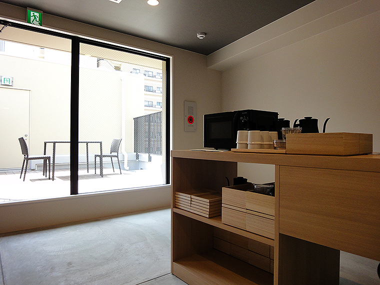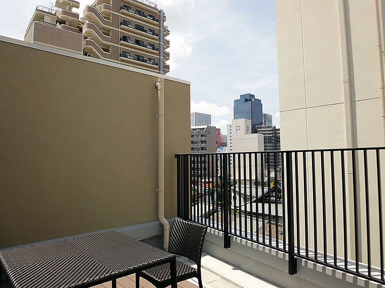 印象的なのは、屋上の共有スペースラウンジ。なんのインパクトもない、テーブルとチェアが置かれた空間だけど、大阪下町の風にあたりながら、ちょっと先に見える梅田の街を眺めていると、なんだか地元のアパートに住んでる感覚に……。