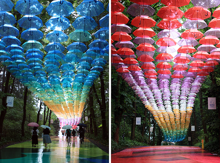 この森の道の上空を虹色に染めているのは、なんと傘。雨の日もなんかハッピーな気分にさせてくれるのは、カラフルな傘のおかげ。