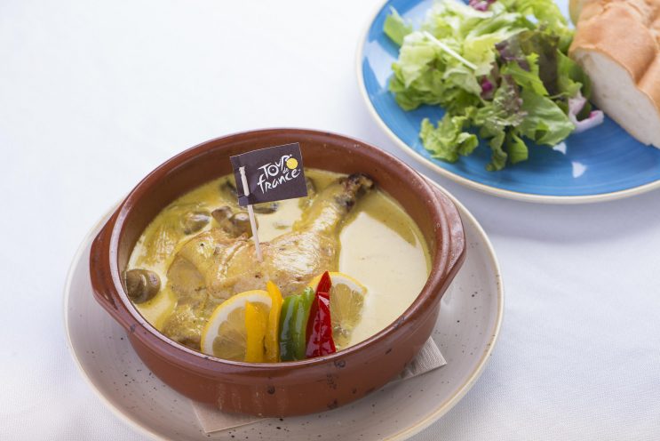 カフェメニューには『ママン(フランス語で「お母さん」)が煮込んだチキンフリカッセ』や『カクテル・ジョーヌ』など、「ツール・ド・フランス」をイメージした商品が全10種。ゲストの2人も試食し、夏にぴったりで美味しいと絶賛されました。