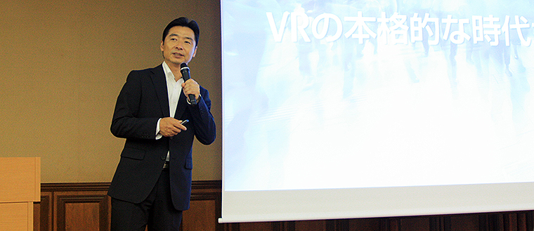 中山首席はまず、仮想空間の市場についてVRゴーグル(ヘッドマウントディスプレイ)を例に紹介。「2025年には、VR市場規模はテレビの12兆円を超え、13兆円へと拡大する見込み」と伝えた。