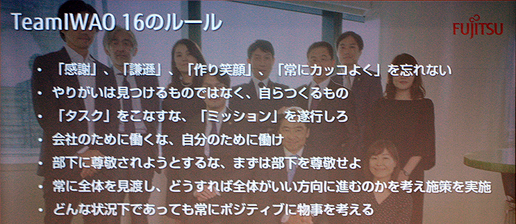 ドローン宅配、AI家電、遠隔医療、スマート農業、スマート経営、自動走行……日本がめざすこうした Society 5.0 実現にむけ、AI人材育成に必要なキーワードはなにか。中山主席は富士通で指揮をとる Team IWAO のなかにある16のルールについて教えてくれた。