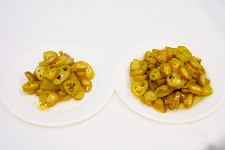 実際にピザに入っているハラペーニョの量がこれくらい。写真左が「メキシカン辛ペーニョ」、写真右が「ちょっと激辛ペーニョ」です。3倍も入っているなんて。。激辛になるわけですね。