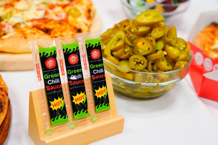 「ハラペーニョ」も旨辛を演出する食材の1つですが、旨辛ピザ最大の秘密は、ピザハットオリジナルの辛味ソース「グリーンチリソース」にあるそうです。