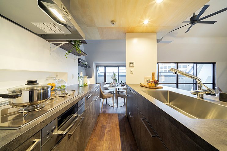 キッチンはオープン型に刷新。ポラス戸建て分譲住宅で採用するGRAFTEKT(グラフテクト)製のキッチン器具が備わる。