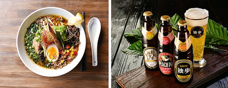・金ごまラーメン「すわき後楽中華そば」:岡山地ビール+揚げ餃子セット 620円~ (右下画像)