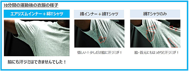 東京の昨年8月の最高気温の平均である32度の環境に設定した人工気象室内で、10分間の運動後、汗ジミとその着心地を「エアリズムインナー+綿Tシャツ」「綿インナー+綿Tシャツ」「綿Tシャツのみ(インナーなし)」の3パターンで比較してみたら……。