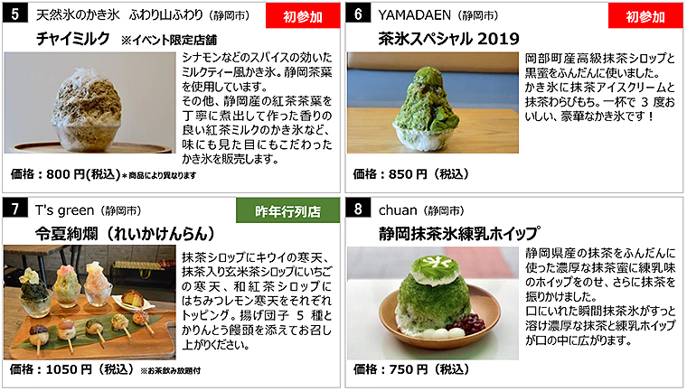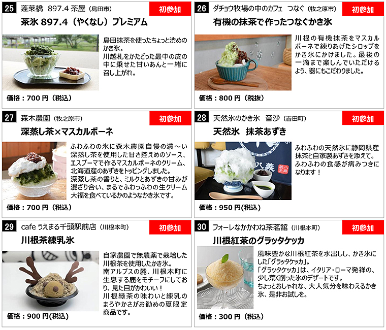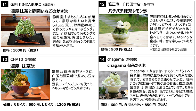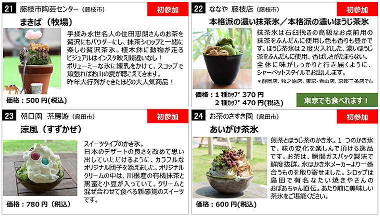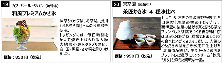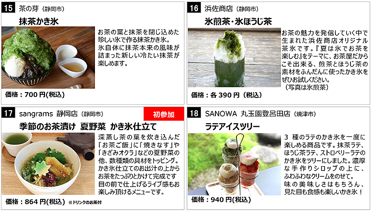 ことしの夏は、この静岡かき氷「茶氷」を出す店舗が増えて、5市2町(静岡市、島田市、焼津市、藤枝市、牧之原市、吉田町、川根本町)から18店舗の新たな店舗を発掘。
