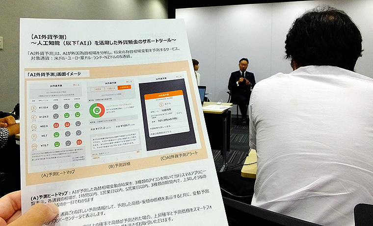 臼井社長◆じぶん銀行では、auペイというキャッシュレスサービスの利用者が400万人を超えた。それでもユーザに、なかなかいい金融体験がない。投資や運用といった、本来の金融の楽しみがない。そうした背景があるなか、われわれが開発した「AI外貨予測」は、ニュース。AIが外貨の為替相場変動を予測するサービスで、実は7割の的中率があると確認されている。これは外貨FXの心強い味方になるし、インターフェースもかんたんで楽しくなるはず。