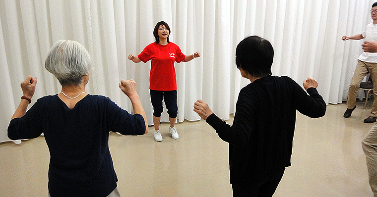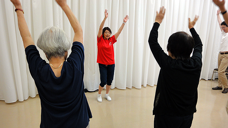 このスローエアロビックは、健康で長生きすることをめざして開発された運動プログラム。日本エアロビック連盟が、脳フィットネスを提唱する筑波大学 征矢英昭教授とともに、認知症予防効果が期待できる軽運動として再構築した軽運動のこと。