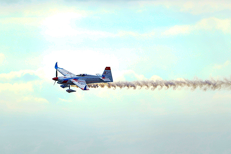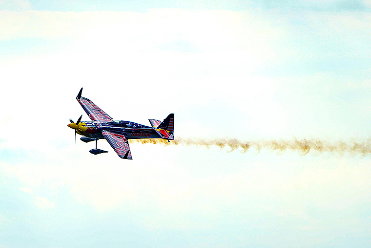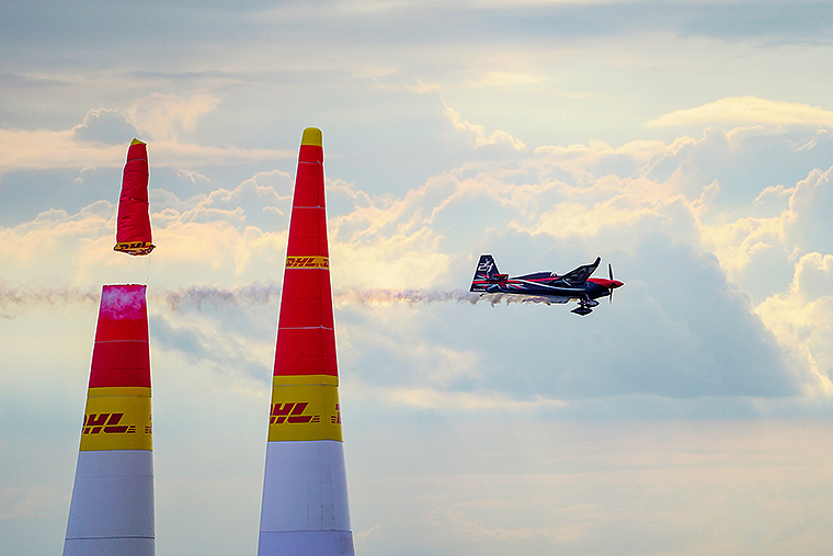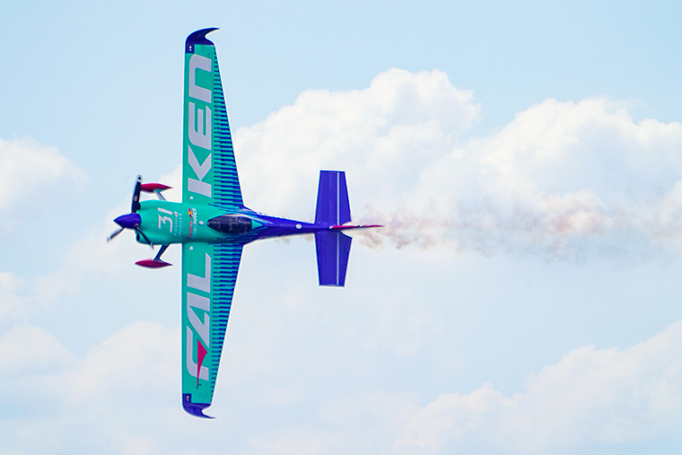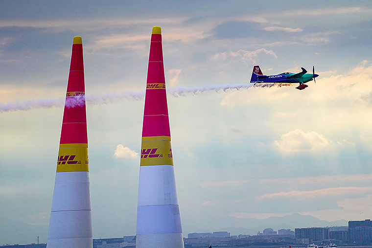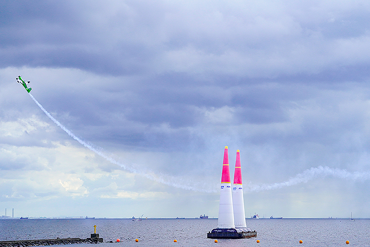 おだやかなオンショアの空を、最高時速375km、最大加速度12Gという人間離れした航行空間で1/1000秒というわずかな差でそのスピードを競う、レッドブル・エアレース。