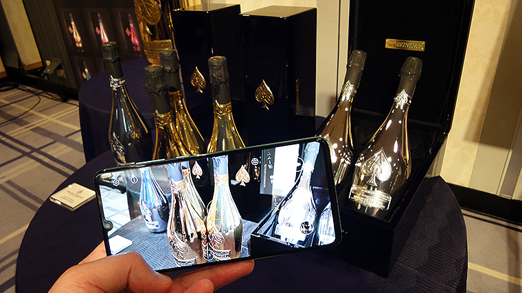 1枚目の画像は、ワイドアパーチャ機能を選択して、なんの狙いもなく一発でおさめた画像。ピントがシャンパンボトルにいき、その前後が深くボケて、遠近感と奥行きを演出してくれている。