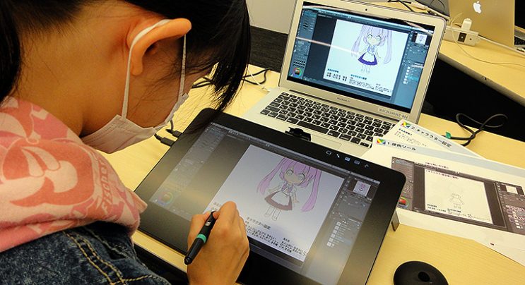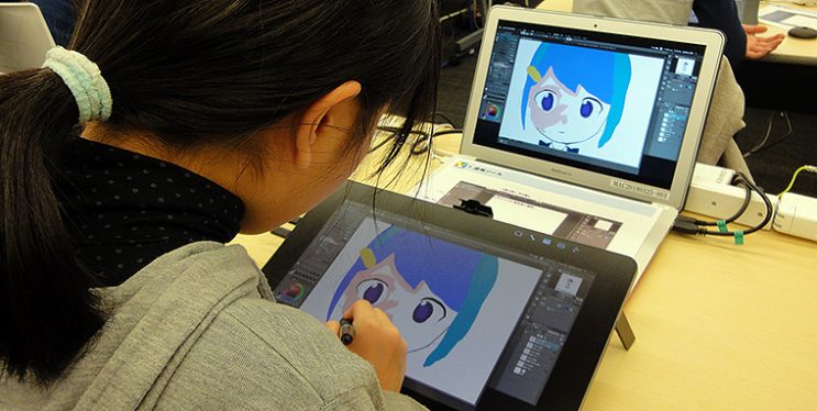 こうしたキャラクター設定の次は、いよいよ液晶ペンタブレットに自由に描いていく。仕事で Windows などに慣れている大人たちにとっては、液晶ペンタブレットの画面をみるだけで拒絶反応を示す人もいるかもしれないけど、これが意外と Adobe Photoshop などと似ていてい直感的。