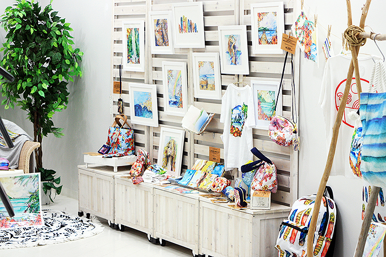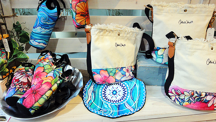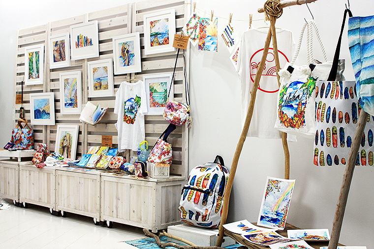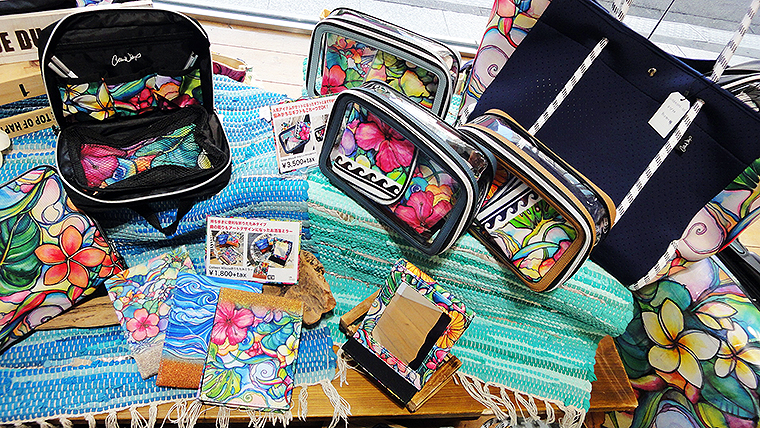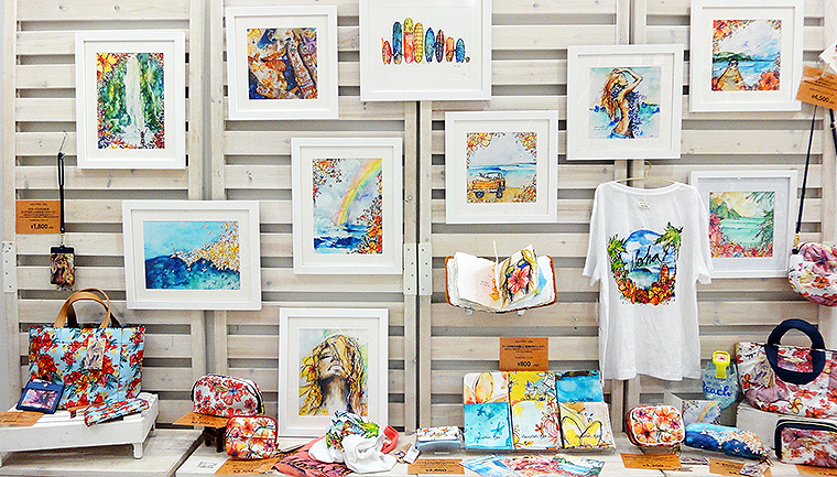 ハワイの海や山でみつけたシーンをモチーフに、鮮やかな色・オーガニックシェイプ・太い線を組み入れることにで、作品に彼女だけが持つ躍動感が宿る―――。