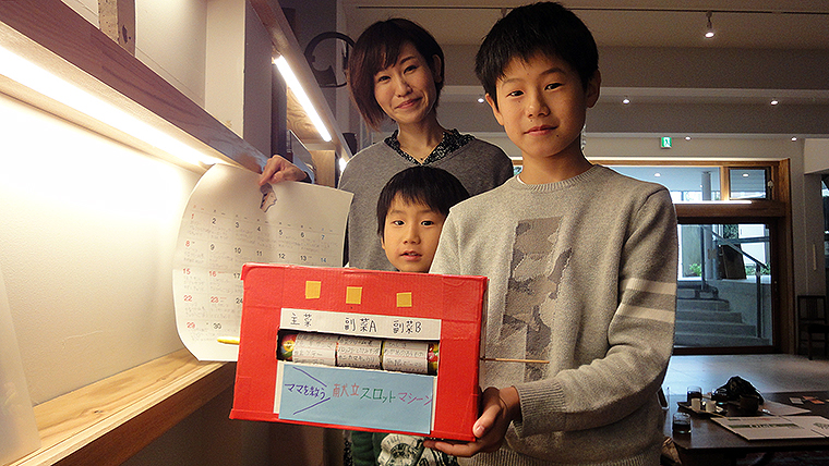 このイベントに参加した たくまくんは、「ぼくは『おやすみ』っていう項目をつくった。『お母さん、きょうは休んでもいいよ』という意味。この『おやすみ』スロットが出たら、ぼくが得意のゆで卵とか目玉焼きをつくる」と笑顔。またそうたくんは「出てほしいのは、カレーライス、おすしかな」とにやにや。