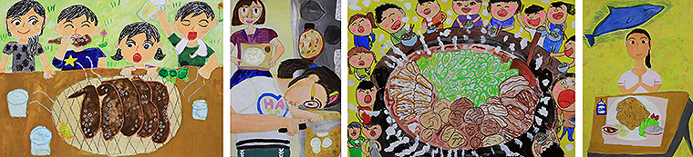 そして絵・イラスト部門では、山形の芋煮、岡山のばら寿司、奈良のかきもち、愛知の手羽先、北海道のいくら丼などが、冒頭の作品メッセージを添えて展示された。