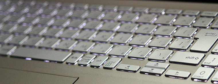 暗闇にも強いイルミネートキーボードを採用し、暗い現場でも生産性アップに貢献。各キーの中心部には 0.15mm の凹みを設け、指になじみやすい快適なタイピングを実現。キーピッチは18.75mm。