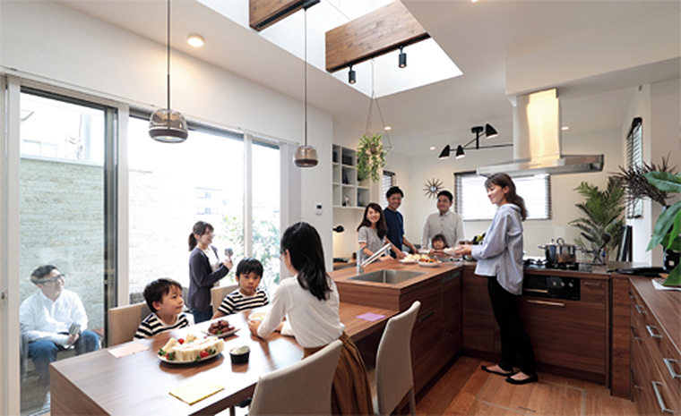 また、モデルプランB(10号棟)では、家族みんなで食事を楽しむ U型キッチンを中心にしたつくりに。キッチンまわりが広々としているだけではなく、作業スペースも充実。料理の家事シェアもスムーズに行えるように仕立てた。