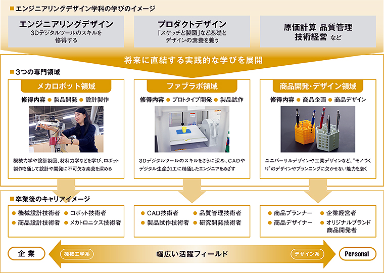 エンジニアリングデザイン学科は、製品開発や設計製作などを習得できる「メカロボット・電気自動車領域」、プロトタイプ開発や製品試作などの「3Dデザイン・3Dマシン」、商品企画や商品デザインなどの「商品開発・デザイン領域」という、3つの専門領域で構成。デジタルファブリケーションを駆使したモノづくりを体得する人材育成プログラムも展開している。