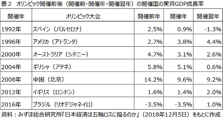 過去30年の夏季オリンピック開催国で開催後にGDP成長率が低下したのはスペイン、オーストラリア、中国、ギリシャ。いずれもITバブル崩壊やリーマンショックなど他の影響が大きいとされている。