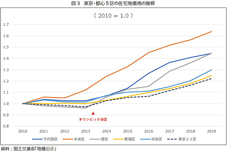 東京2020オリンピック開催が決定した2013年9月から、東京の公示地価の上昇が始まっている。アベノミクスによる金融緩和政策が反映されているといえる。また、金融機関が不動産向け融資を大幅に増やしたことも影響している。