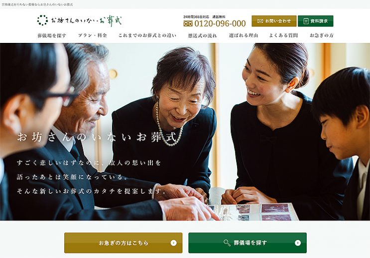 この「お坊さんのいないお葬式」は、大切な故人への想いに寄り添った「想送式」を執り行える葬儀会館を紹介するポータルサイト。