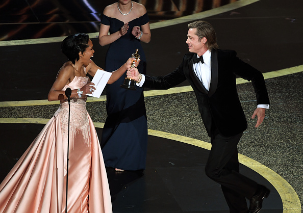 HOLLYWOOD, CALIFORNIA – FEBRUARY 09: (L-R) Regina King presents the Actor in a Supporting Role award for ‘Once Upon a Time…in Hollywood’ to Brad Pitt onstage during the 92nd Annual Academy Awards at Dolby Theatre on February 09, 2020 in Hollywood, California. (Photo by Kevin Winter/Getty Images)
