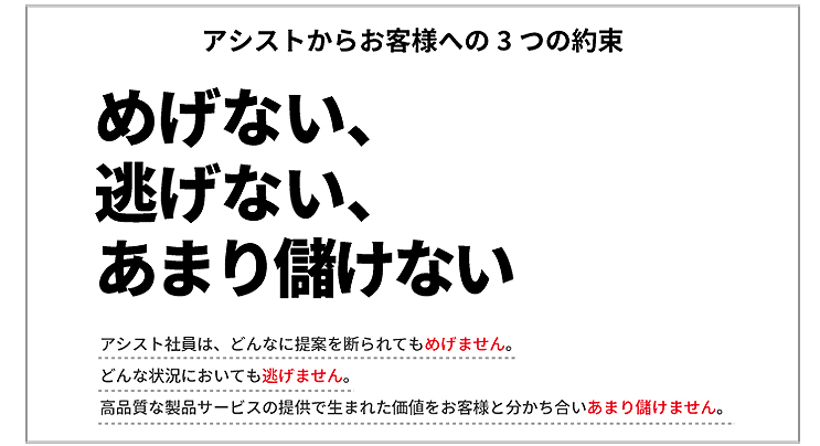 この好調を支えるのが、アシスト全社員が貫く「めげない」「逃げない」「あまり儲けない」という姿勢だ。