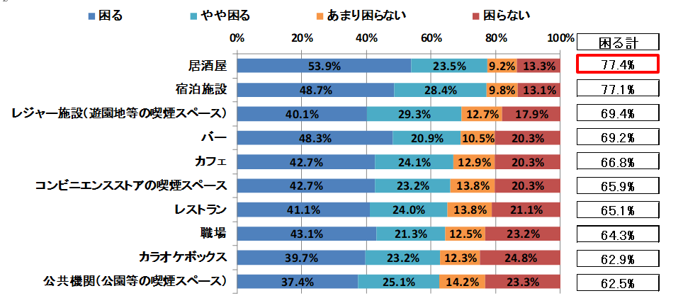 「居酒屋」が最も多く77.4%。今回の全面施行で実際に規制される場所が1位に。