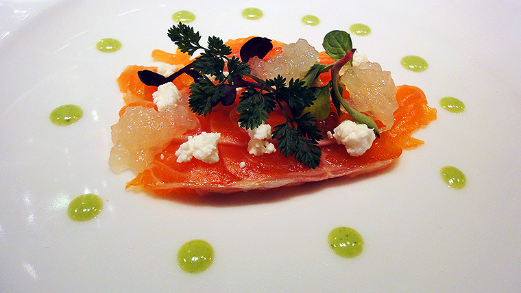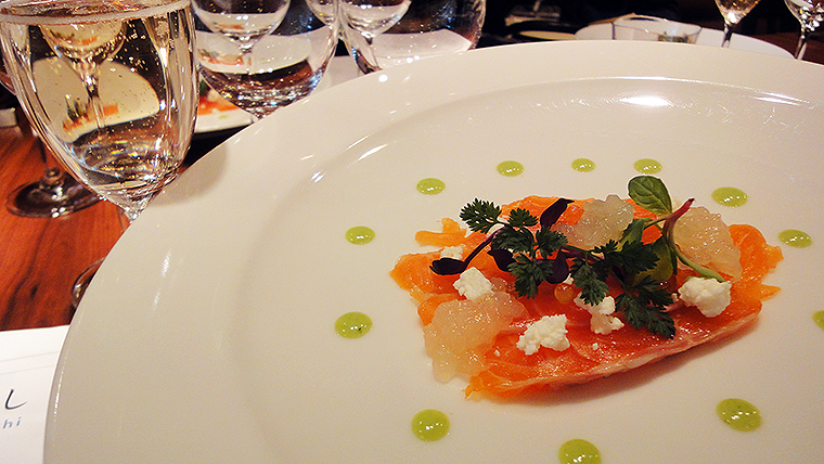 「希少なキングサーモン(鱒の介)とトラウトをかけ合わせた『富士の介』は、脂肪が適度に入ったまろやかな味わい。今回は、甲州スパークリングにあわせるため、山梨県産の牛乳にレモン汁を加えて固めた自家製リコッタチーズと、イワナの卵をトッピングしました」