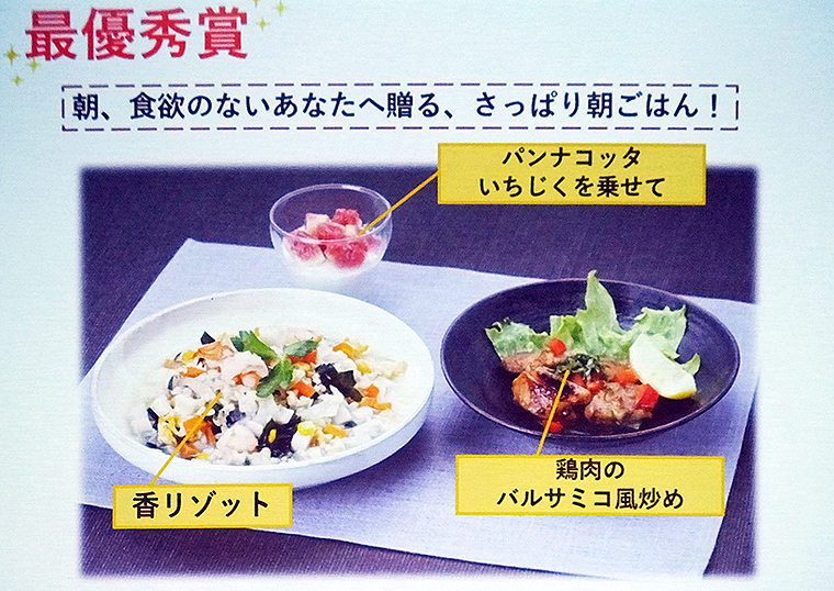 出来上がったメニューは、規定ルール内ギリギリの569kcal・食塩2.6g。忙しい朝も30分でつくれる「香リゾット」「鶏肉のバルサミコ風炒め」「パンナコッタいちじくをのせて」の3品をそろえた。