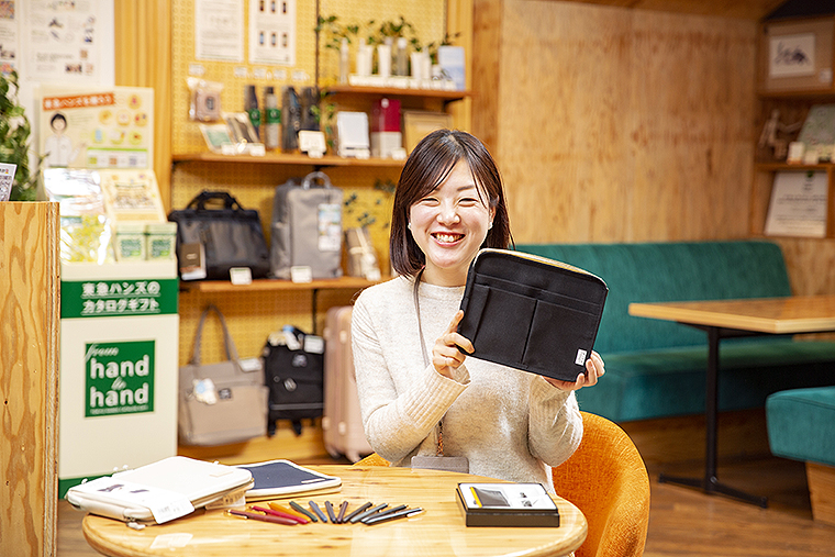 ステーショナリー担当バイヤーの今津さんは、さまざまな用途で使える「HINEMO スタンドポーチ」や、ボールペンなどをプッシュ。