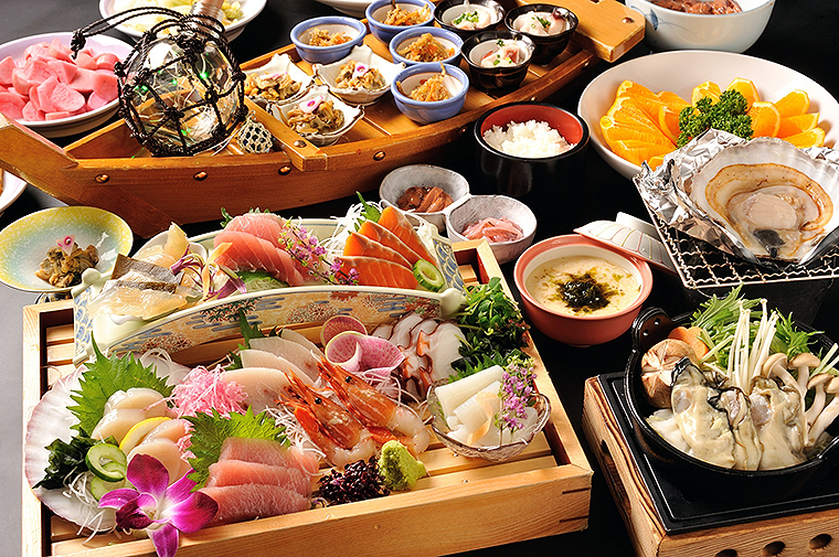 三陸海岸を目の前に、無煙ロースターテーブルで快適に海の幸を堪能。新鮮な海の幸を素材の味そのままにテーブルで焼いて。ミニビュッフェには港町「気仙沼」の郷土料理や、日本を代表する天然の良港、気仙沼港で水揚げされた海の幸も堪能できる。