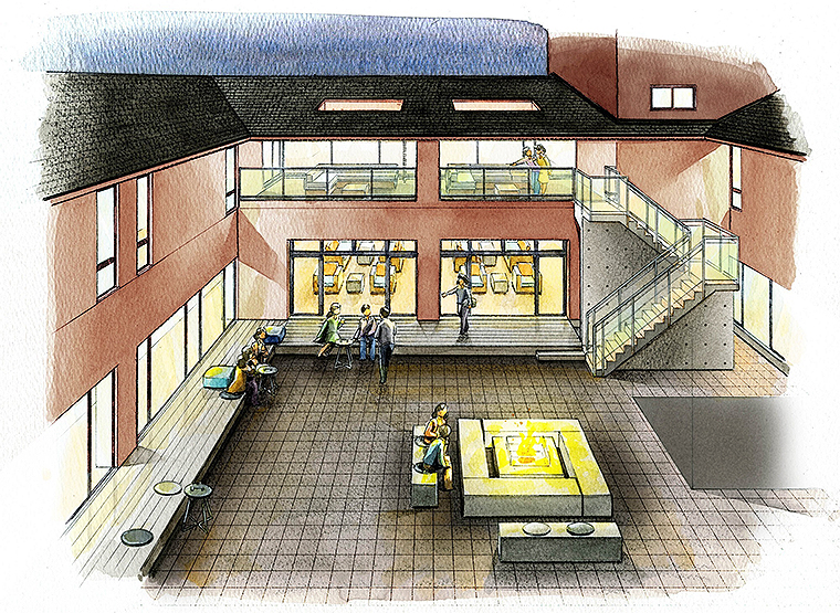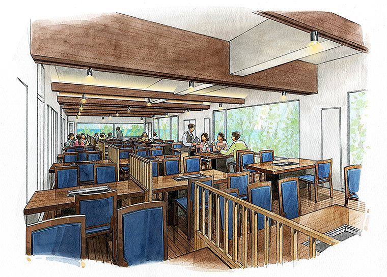 リニューアルコンセプトは、「気仙沼の自然、食、文化を楽しめる」。空を見上げられるオープンエアバルコニー、中庭には縁側と暖炉を用意し、自然の遷り変りを感じられるスペースを増設した。